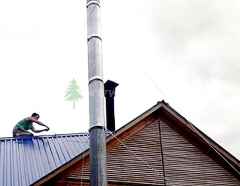 Также применяются для фиксации дымохода растяжки из стальных тросов или прутьев, крепящихся в специально предусмотренных хомутах с ушками с одной стороны и в рым-шпильках с талрепами (или при помощи анкеров) с другой. Дымоход по высоте монтируется из того расчета, чтобы он был выше конька крыши более, чем на полметра и находился от него в одном-двух метрах.