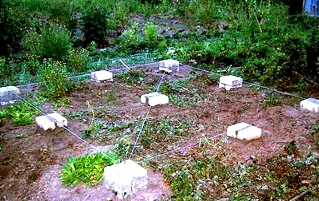 Также и на глинистом грунте, подверженном вспучиванию, фундамент сооружается столбчатый. В этом случае количество стоек не должно быть большим шести и располагаются они по периметру, так как промерзает грунт под строением медленнее и в случае размещения в нём столбов фундамента перекоса избежать не удастся. Если же грунт устойчив (состоит из песчаных или скальных пород), фундамент углубляется не более, чем на полметра.