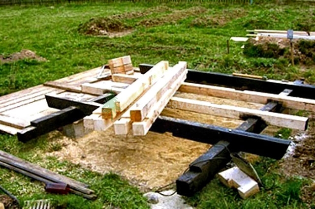 В ямы подсыпается щебень и утрамбовывается. По периметру ямы выстилается поливинилхлоридная плёнка для предотвращения примерзания грунта к опорам. Затем в ямы устанавливаются подготовленные брусья строго вертикально и фиксируются на время их бетонирования. Бетонирование делается с излишком для придания ему формы холмика с некоторым уклоном. После высыхания бетона делается обвязка брусом нужного сечения верхней части опор.
