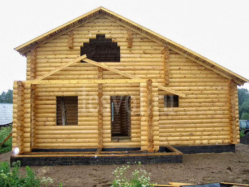 Фундаментом для бревенчатого сруба могут быть как лента (то есть сплошное основание), так и бетонные или кирпичные столбы. Выбор фундамента зависит от типа грунта, на котором стоит дом. Чем более грунт топкий, тем прочнее и монолитней должен быть фундамент. Для обустройства пола и потолка используются либо брёвна небольшого диаметра, либо брусья – лаги. Лаги образуют каркас, на который укладываются половицы. Каркасом для кровли служат или пиломатериалы, в сечении приближенные к брусу, либо тонкие брусья.